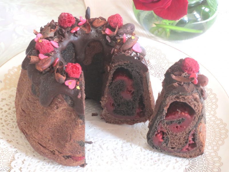 手作りラズベリーシートを巻き込んでクグロフ型で華やかに焼き上げます。